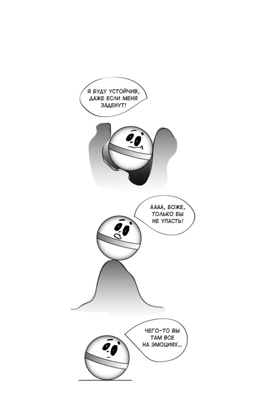 Кое-как проехали страшную математику статики. Остались только слова. А именно: заумные рассуждения на тему, как лучше держать тело, чтобы оно не упало, и какие вообще могут быть равновесия. Да, у равновесий тоже есть виды, оказывается! Отвлечёмся от качелей и весов, проще всего эти виды равновесия понять так: взять шарик и кинуть его в канаву-кювет U-образной формы. Шарик поболтается туда-сюда, после чего остановится на дне в середине (если смотреть вдоль, по канавке). Попытаешься толкнуть шарик – он снова покатается вправо-влево, но, в конце концов, всё равно вернётся в центр. Это устойчивое равновесие – если вывести шарик из равновесия, он со временем вернётся в него. Считается, что девушки любят парней, находящихся в устойчивом эмоциональном равновесии (то есть если человека «задеть», то он со временем всё равно успокоится и будет, как ни в чём не бывало). Эмоции, конечно, не шарик, расчётам не поддаются. Но суть та же самая – это тоже устойчивое равновесие. Хуже, когда оно неустойчивое: это значит, что невероятными усилиями мы добиваемся равновесия, а потом что-то выводит из него – и всё. Обратно просто так, сам собой, уже не вернёшься. Как таких товарищей называют? Правильно, нытиками. Если не обижать людей и показать на том же шарике – его можно положить, например, на компьютерную мышку (конечно, так, чтоб не двигался). Если его задеть, то он упадёт и, конечно же, обратно не запрыгнет. А вот когда шарик оказался на ровной поверхности стола – он в безразличном равновесии. Тронешь его – он поедет, но потом остановится, как ни в чём не бывало и по-прежнему останется в равновесии. Разница между этими тремя равновесиями – в силе, возникающей при отклонении. Когда равновесие устойчивое, при выведении из него возникает сила, стремящаяся вернуть в положение равновесия (в примере с шариком – сила тяжести). Когда неустойчивое – сила тоже возникает, но она при этом стремится вывести тело из равновесия ещё сильнее (в примере – тоже сила тяжести). Когда безразличное – никакой силы, стремящейся поддержать или подавить равновесие, не возникает. Умники могут возразить: а как же сила трения? Шарик-то трётся о поверхность! На что у меня припрятан туз в рукаве: соль здесь не только в силе, а ещё и в энергии. Об этом – буквально через пару разделов. В двух словах, в чём различие по ней: потенциальная (не пугаться и не смеяться!) энергия тела при выведении из устойчивого равновесия возрастает, при выведении из неустойчивого – уменьшается, а при безразличном – не меняется вообще.