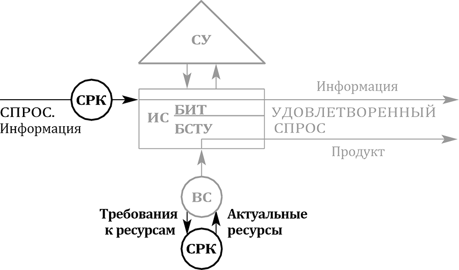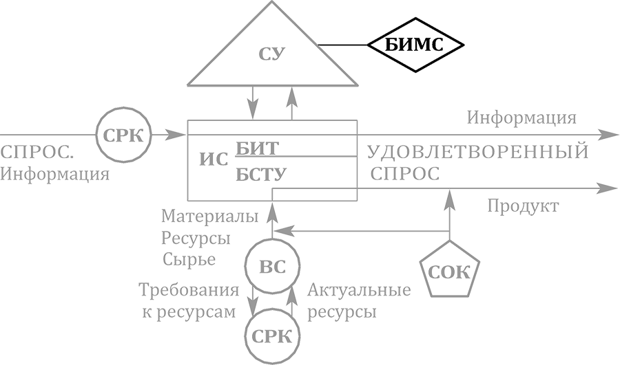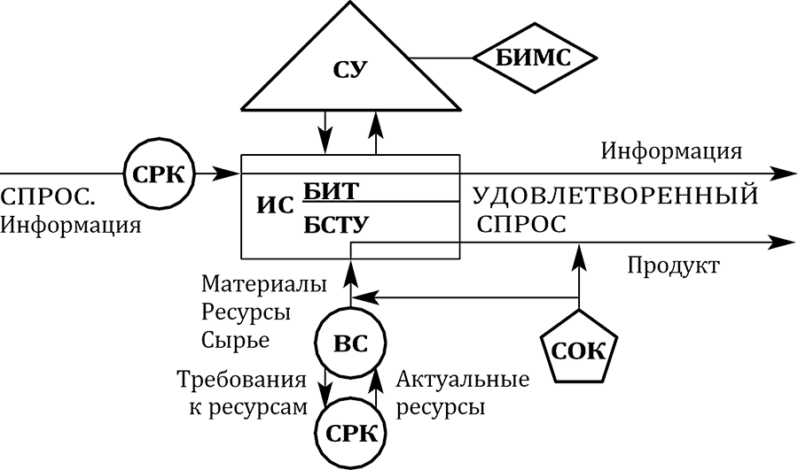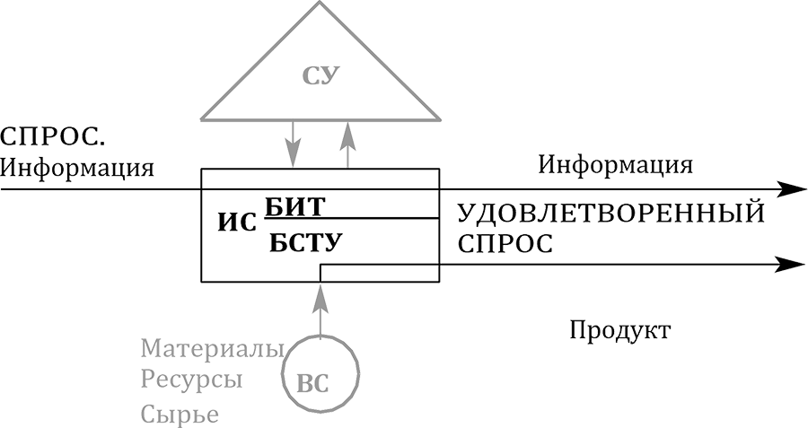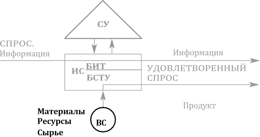 ИС – исполнительная система; СУ – система управления; БИТ ИС – блок исполне- ния требований исполнительной системы; БСТУ ИС – блок создания товара или услуги исполнительной системы; ВС – вспомогательная система