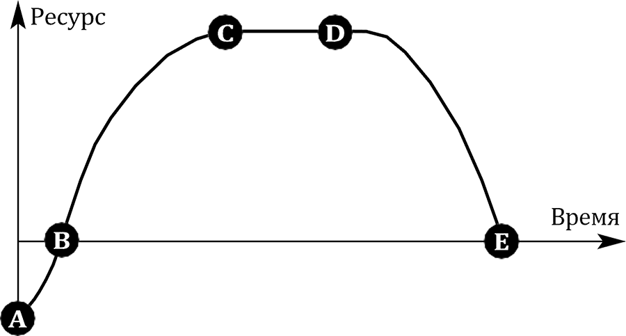 Жизненный цикл любой бизнес-системы – определяющая характеристика как собственно для бизнес-системы, так и для системы любого рода. В зависимости от стадии ее развития меняются количество и качество элементов системы, связи между элементами, способы реализации совокупных процессов системы, способы взаимодействия с внешней средой и т. п. Поэтому определение и понимание стадии развития бизнес-системы – наиболее значимый фактор (151) при рассмотрении любых характеристик бизнес-системы. Основная проблема при определении стадии развития бизнес-системы – параметры характеристик бизнес-системы. Они могут быть идентификаторами характеристик системы, соответствуя определенной стадии ее развития. Характерный показатель (87) такого рода – ресурс системы. Изменение ресурса системы во времени может быть комплексной характеристикой развития бизнес-системы в целом. В наиболее общем виде развитие любой системы (и бизнес-системы, в том числе) можно представить в виде графика жизненного цикла системы (рис. 1.15).
