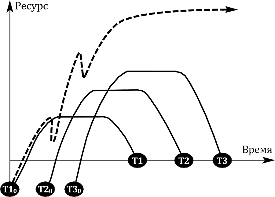 В характеристиках, подобных жизненному циклу бизнес-системы, применяется допустимая степень упрощения. Приведенный график изменения ресурса (см. рис. 1.15) наиболее характерен для системы, которая реализует устойчиво повторяющийся один и тот же процесс удовлетворения внешнего требования. В реальной среде существование бизнес-системы всегда обусловлено одновременной реализацией отклика (в виде товара или услуги) на несколько запросов потребителей из внешней среды, которые могут быть актуализированы одновременно либо со сдвигом по времени. В случае временного сдвига возникновение последующих процессов (т. е. нахождении их в стадии инициации, возникновения и развития), как правило, сопровождается нахождением предыдущих процессов в области стагнации или спада. Указанную тенденцию наиболее полно удобно представить в виде рисунка (рис. 1.16), где указано несколько различных процессов, возникающих в разное время. Их наличие позволяет поддерживать и увеличивать рост совокупного ресурса системы в целом.