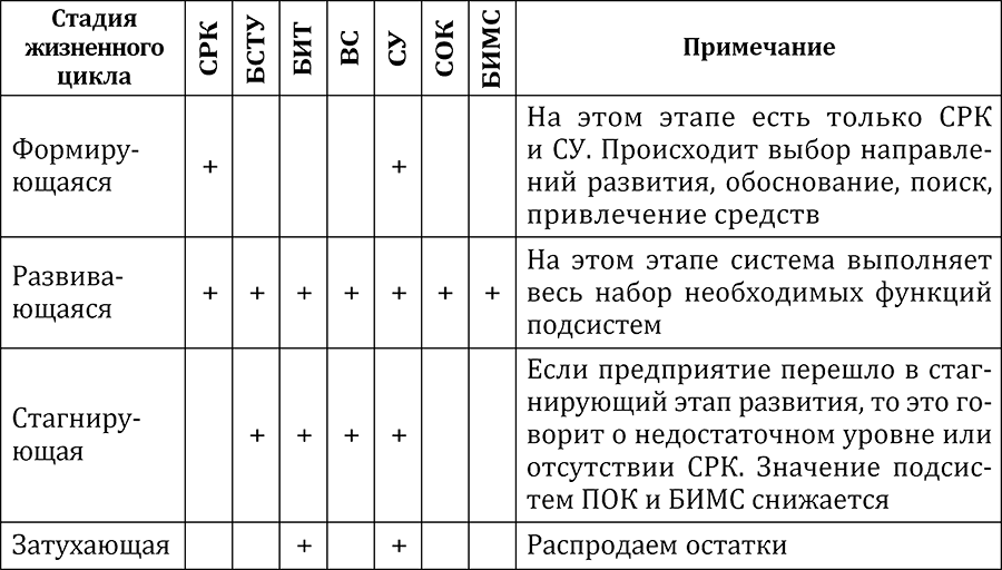 Изменение ресурса системы отображает изменение целого комплекса частных показателей ее состояния. Применительно к бизнес-системам рост ресурса отражает рост численности работающих, и увеличение доли рынка, изменение количества акционеров, и другие показатели. В зависимости от стадии развития бизнес-системы (точнее, применительно к ней) можно определить необходимость формирования подразделений или потребность в специалистах той или иной подсистемы. Например, на начальной стадии развития компании при минимальной численности и локальном рынке сбыта абсолютно неочевидна необходимость выделения блока маркетинга. Эта функция может быть совмещена с блоком продаж, который еще может исполнять и закупки. То есть возникает смешение работ (подсистем), которое на данном этапе развития, возможно, и оправдано. Но это же смешение становится недопустимым при росте численности свыше ста человек, сопровождающемся выходом на новый уровень рынка сбыта. Как минимум, уже требуется выделение и развитие блока маркетинга. Примерные требования к выделению подразделений соответствующих подсистем представлены в табл. 1.1.