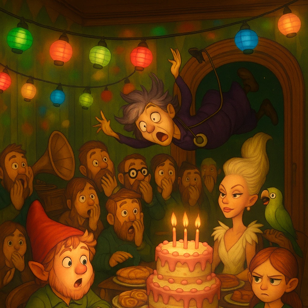 Как гуси спасли однажды человеческий Рим, так и попугай Аристарх решил сыграть свою птичью роль в гномьей истории. Нагнетая тревогу, он завизжал свою коронную фразу так сильно, что стеклянная посуда в домах начала лопаться:
