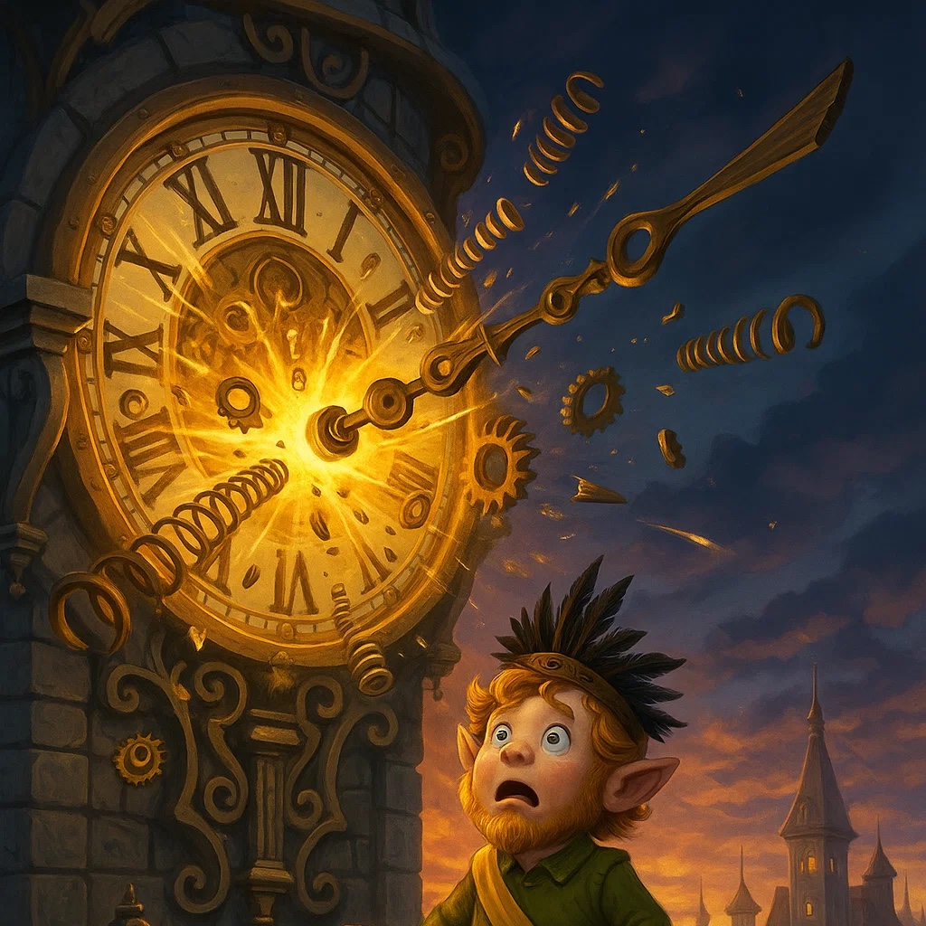 Что-то внутри звякнуло и заскрежетало. Часовые колесики, страшно скрипя, завертелись в разные стороны. Часовая стрелка закрутилась в обратную сторону.