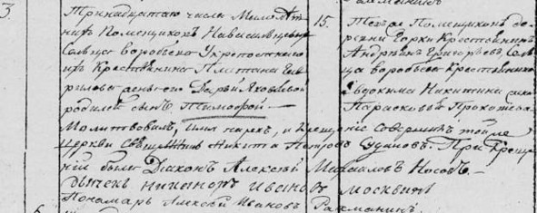 Агафия Никитина, оба православного исповедания. [Крестные] дер. Воробьева кр. Алип Платонов и Прокопия Петрова жена Дарья Харитонова. Прих. свящ. Василий Иоаннов с диаконом Владимиром Алексиевым и пономарем Алексием Лукиным.