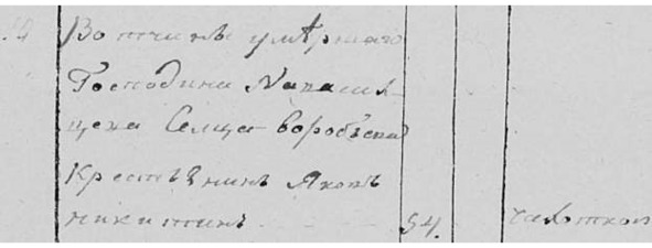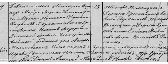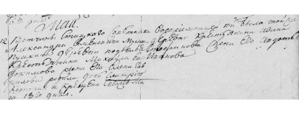 Метрическая книга с. Красного 1802 г. «Май. №12. Вотч. стат. сов. Александра Семеновича Мусина Пушкина д. Подъелья кр. Михаила Евдокимова жена его Елена Гаврилова родила дочь Гликерию, кот. и крещена сего ж мая 18 дня. Восприемницей той была той же д. кр. Ивана Стефанова жена его Авдотья Иванова».