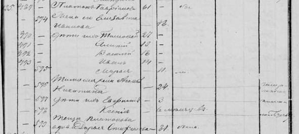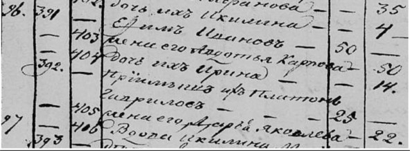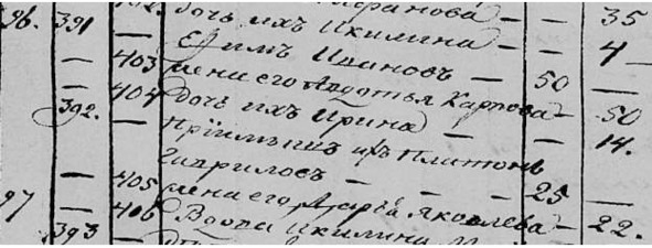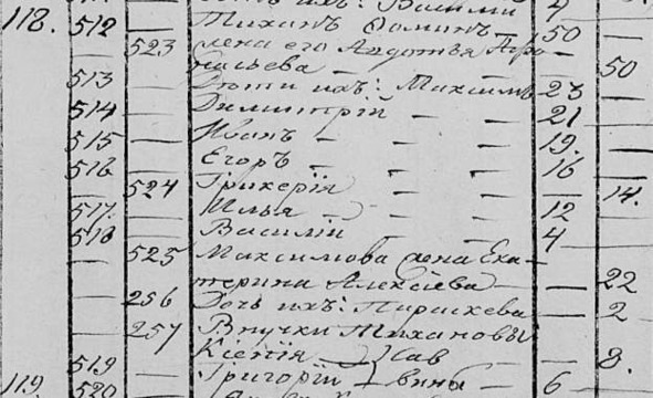 Афанасьева 50. Дети их: Максим 23. Димитрий 21. Иван 19. Егор 16. Гликерия 14. Василий 4. Максимова жена Екатерина Алексеева 22. Дочь их Параскева 2. Внучки Тихоновы: Ксения 8, Григорий 6 Саввины.»