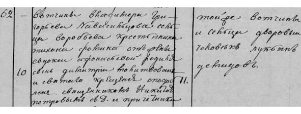 Метрическая книга с. Красного. Октябрь 1819 г. «№62. 10 [октября] Вотчины Владимира Григорьева Новосильцева сц. Воробьева кр. Тихона Фомина от жены Евдокии Афанасьевой родился сын Димитрий. Молитвован и св. крщения сподоблен свяш. Никитою Петровым с д. и прич. 11 [октября – крещение]. Той же вотч. и сц. Дворовый человек Лукьян Демидов».