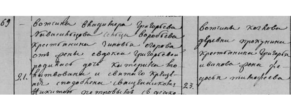 Метрическая книга с. Красного. Ноябрь 1819 г. «№69. 21. Вотч. Вл. Григ. Новосильцева сц. Воробьева кр. Зиновия Егорова от жены Евдокии Григорьевой родилась дочь Катерина. Молитвована и св. крщения сподоблена свяш. Никитою Петровым с д. и прич. 23. Вотч. Козлова д. Прокунина кр. Григория Иванова жена Федосья Тимофеева».