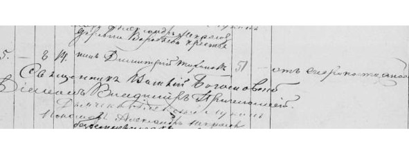 Метрическая книга с. Красного. Март 1894 г. «№5. Вотч. секунд майора Григория Семенова сына Новосильцева сц. Воробьева у кр. Якова Назарова от жены Натальи Иосифовой род. Дочь Дарья 19. Крещения ж сподоблена 20-го числа… Восприемницей ей была вотч. стат. сов. Александра Семенова Мусина Пушкина д. Подъелья кр. Михаила Федулова жена Анна Мокиева».