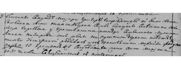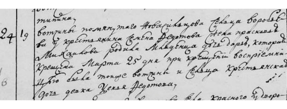 Метрическая книга с. Красного. Март 1780 г. «№24. 19. Вотч. помянутого Новосильцова сц. Воробьева у кр. Семена Федотова жена Прасковья Михайлова родила младенца дочь Дарью, которая крещена 25 марта при крещении восприемницею была той же вотч. и сц. кр. дочь девка Ксенья Федотова».