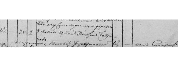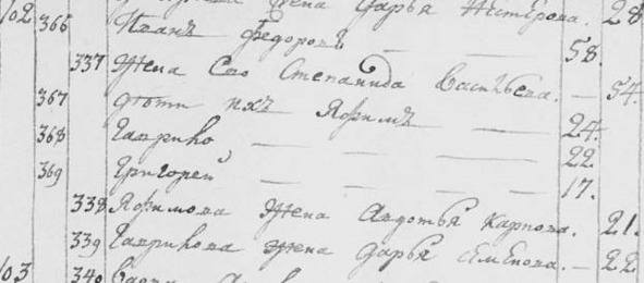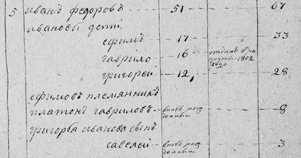 Ревизская сказка сельца Воробьева. 1811 г. «Иван Федоров 51 [в 1795 г.]. 67. Ивановы дети: Ефим 17 [в 1795 г.]. 33. Гаврило 16 [в 1795 г.]. Отдан в рекруты в 1802 г. Григорий 12 [в