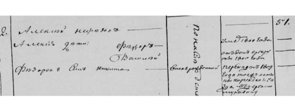Ревизская сказка 1811 г. с. Красного с деревнями. «№2. Алексей Нефедов. 51. Алексея дети: Федор. Умер 1800 г. Василий. Отдан в рекруты 1800 г. Федора сын Никита. Вновь рожденный. Переведен 1809 года той же вотч. Корчевского у. в д. Муравику».