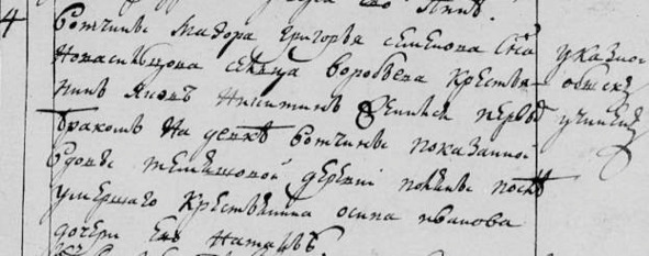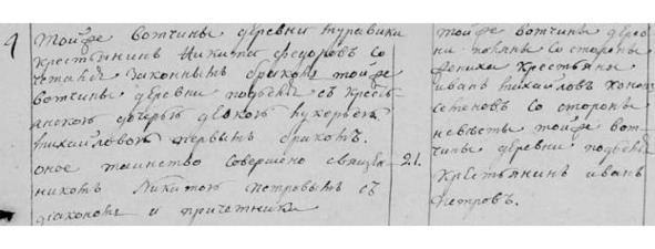 Новосильцева сц. Воробьева кр. Яков Никитин женился пер. бр. на девке вотч. показанной вдовы Темяшовой д. Поляны после умершего крестьянина Осипа Иванова дочери ево Наталье. Указной обыск учинен».