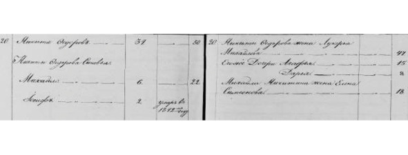 Федорова сыновья Михайло 6 [в 1834]. 22. Иосиф 2 [в 1834]. Умер в 1842 г. Никиты Федорова жена Лукерья Михайлова. 47. Его же дочери Агафья. 15. Дарья. 8. Михайла Никитина жена Елена Семенова 18.».