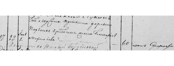 Метрическая книга с. Красного. Май-июнь 1861 г. «№17. 29 [мая]. Июнь 1. Г-на Мусина Пушкина д. Подъелья кр. жена Гликерия Михайлова. 60. От старости».