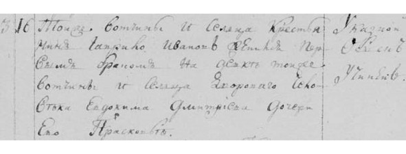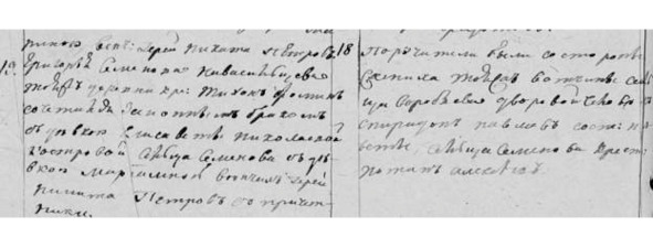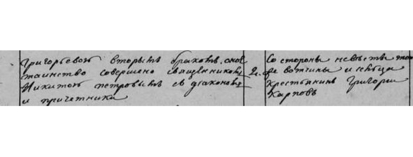 Иванов женился перв. браком на девке той же вотч. и сц. дворового человека Евдокима Дмитриева дочери его Прасковье. Указной обыск учинен». Метрическая запись о браке содержит ошибочную информацию – Гавриилу записали не ту жену! Возможно, священник, делавший запись, был уже совершенно пьян, как это было обычно в то время