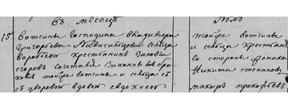 Метрическая книга с. Красного. Февраль 1833 г. «3. Тринадцатого числа малолетних помещиков Новосильцевых сельца Воробьева у крепостного их крестьянина Платона Гаврилова жены его Дарьи Яковлевой родился сын Тимофей. [Дата крещения] 15. Тех же помещиков дер. Горки кр. Андреян Григорьев, сц. Воробьева кр. Евдокима Никитина жена Парасковья Прокопиева. Молитвовал, имя нарек и крещение совершил той же церкви свящ. Никита Петров Судаков. При крещ. Были диак. Алексей Михайлов Носов, дьяч. Никанор Иванов Москвин. Поном. Алексей Иванов Рахманов».
