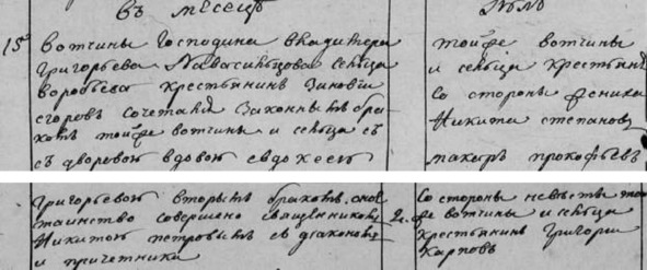 Метрическая книга с. Красного. Февраль 1812 г. «№19. Григория Семенова Новосильцева той же дер. кр. Тихон Фомин сочетался зак. бр. с девкой Елисаветы Николаевой Костровой сц. Семенова с девкою Мариамной. Венчал иер. Никита Петров… 18. Поручители были со стороны жениха той же вотч. сц. Воробьева дворовой человек Спиридон Павлов. Со стороны невесты сц. Семенова кр. Потап Алексеев».