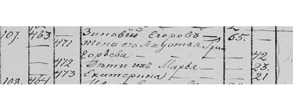 «Зиновий Егоров 65. Жена его Авдотья Григорьева 42. Дети их Марья 23.