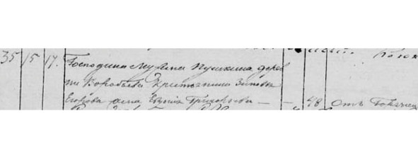 Метрическая книга с. Красного. Февраль 1835 г. «№4. Девятого числа помещика инженер майора Лариона Александрова Мусина Пушкина дер. Подъелья у креп. его кр. Никиты Федорова и закон. жены его Гликерии Михайловой родилась дочь Агафья. [Крестные] Того ж помещ. и дер. Кр. Василий Евдокимов. Того ж пом. и дер. кр. Елисея Михайлова жена Наталья Данилова».