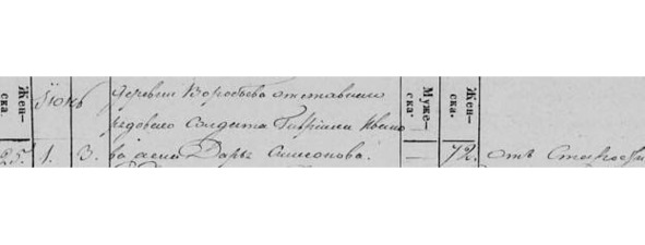 Метрическая книга с. Красного. Июнь 1851. «№25. 1. 3. Д. Воробьева отставного рядового солдата Гавриила Иванова жена Дарья Симеонова. 72. От старости».
