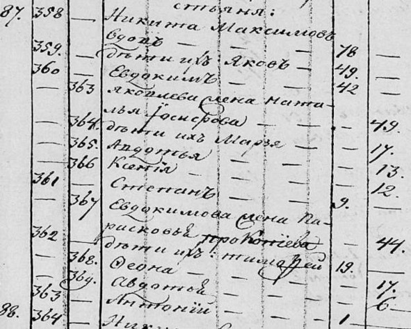 Марья 17. Авдотья 13. Ксения 12. Степан 9. Евдокимова жена Парасковья