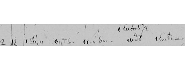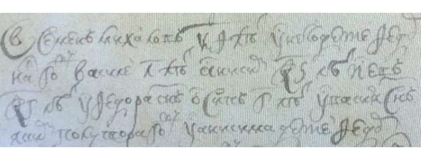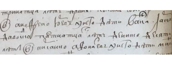 ж. Фекла Денисова д. 30 л. вз. Кашинской гм. вот. д. Ластомы. У них д. Варвара 10 л., Прасковья 7 л. Тимофей Иванов. (12) 29. У него ж. Пелагея Нефедова д. 25 л. г.м. вот. д. Поляны. У них д. Василиса году. У него ж Ивана Степанова дети приж. Со вт. ево ж. показ. Прасковьей Яковлевой д. … с. Никита. 4, доч. Устинья 10 л., Харитина полугоду».