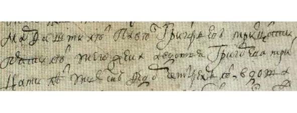 1717 г. Книга переписная. «в сц. Крупенине… Павел Григорьев тритцати пяти лет у него жена Авдотья Григорьева трицати лет у них сын Федор четырех лет».