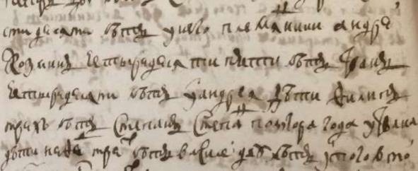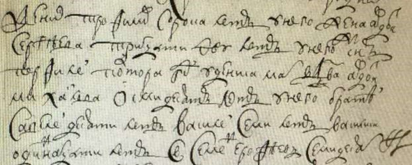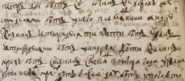 Переписная книга 1709 г. Д. Поляна. «Андрей Козмин четыредесяти пяти лет Иван четыредесяти лет У Андрея дети Филип трех лет Степан полутора года У Ивана дети Нефед трех лет Василей дву лет».