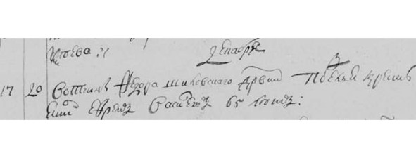 1760 г. «Январь. 20. Вотч. Ульяна Тимофеева Опрева сц. Горки кр. Иван Никифоров 70 лет».