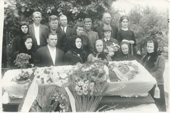 Похороны мамы бабушки Агафьи Лукиничны. Мария Васильевна в центре, третья справа. Слева от нее сестры Шура и Нюра, справа брат Иван Васильевич Петров и жены братьев. Брат Алексей в верхнем ряду второй справа.