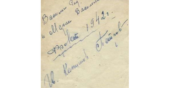 «Василию Род. и Марии Васильевне. Фронт 1942 г. Гв. Капитан Петров».
