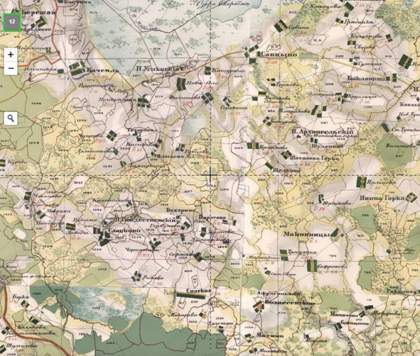 Карта мест, где жило большинство предков Петровых. В юго-западной четверти в центре с. Славково и погост Рождественский. Западнее их с краю сельцо Подберезье. В самом югозападном углу деревни Борки и Коляково. Рядом с селом и погостом деревни Горбуново, Раднево. На юге, по центру карты, сельцо Холстово к юго-востоку от села Спасского. В северо-западной четверти бывшее село Пантелеево рядом с селом Кочемля. Восточнее д. Новое Село, рядом с которым погост Успенский на болоте, который также был приходской церковью предков. Южнее деревня Чупрово, сельцо Тетерино, д. Власьево. В северовосточном квадрате село Бакланово. В юго-восточном квадрате село Ивина горка. На юге этого квадрата ближе к центру села Вознесенское и Матино и сельцо Мостищи.