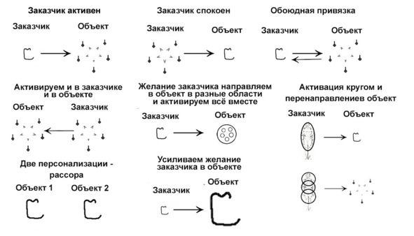 Мы рассмотрели пары – активация-персонализация. Активация-активация. Они вызывают тягу. Но если мы работаем с парой персонализация – персонализация, то тут возможны свои варианты. Если мы их просто помечаем на объектах без стрелочек и линий связывающих их, то это приведёт к их взаимному отторжению. Наподобие отталкивания одноимённых зарядов. Но есть ещё вариант использования двойной персонализации. Мы отмечаем заказчика персонализацией, и направляем её влияния в объект, который отмечаем так же персонализацией, но увеличенного размера. В этом случае мы увеличиваем желание заказчика в объекте влияния.