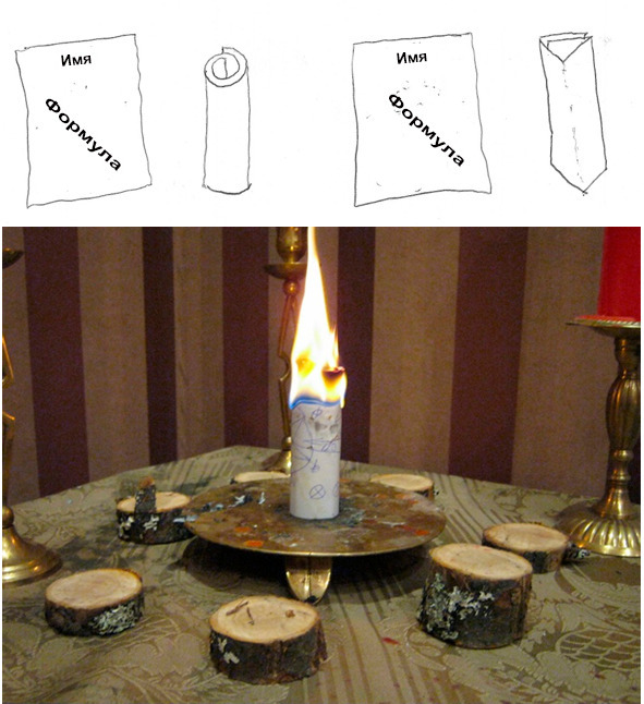 После сворачивания в трубочку или треугольник фотографию можно оставить храниться в вертикальном варианте. А можно усилить своё воздействие, для этого трубочку нужно сжечь. Для нашего сознания этот акт тоже имеет глубокий смысл. Вот у нас был носитель информации с магической формулой. А вот теперь информация перешла в другую форму – пепел и дым. Для нашей психики – это равносильно переносу действия сразу в общее для всех пространство, на деле – в коллективную память.