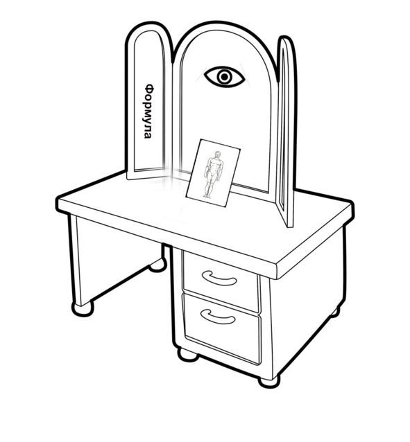 Входим в рабочее состояние визуализируя Духа за спиной. На центральном зеркале рисуем символ, который мы ранее не рассматривали – глаз. Веретено, с кругом внутри не касающегося контура глаза, и точкой в центре. На одном из боковых зеркал чертим формулу которую хотим запустить в объекте воздействия. Боковые зеркала ставим параллельно друг другу образуя тем самым бесконечный зеркальный коридор. Фотографию объекта кладём или опираем на центральное зеркало меж двух боковых зеркал. Ощущаем мощь сформировавшейся конструкции, как действие и смыслы нанесённые нами отражаются бесконечное количество раз вместе с объектом воздействия. Дожидаемся ощущения само поддержания этого процесса. отвлекаемся. Уходим оставляя фото между зеркал.