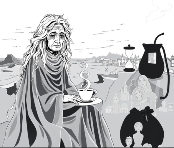Она сидит за столом у окна, через которое видно только проклятие бытия. Он пьет что-то темное, похожее на выдержанную клятву.