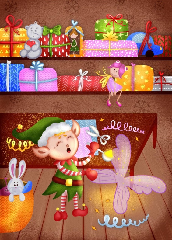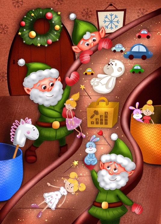 Накануне Нового года в мастерской Деда Мороза кипела работа. Эльфы и гномы читали письма детей и собирали подарки в соответствии с их пожеланиями. В огромном зале был установлен длинный конвейер, по которому медленно ехали самые разные игрушки: куклы в нарядных платьях, машинки всех моделей и размеров, конструкторы для мальчиков и девочек, настольные игры, книжки, плюшевые животные и много всего другого, что так любят дети. Вдоль конвейера стояли гномы, которые снимали игрушки с транспортной ленты, выкрикивая название подарка, имя ребёнка, которому он предназначен, и город, куда его надо доставить: «Кукла-русалка для Ани из Иркутска!», «Набор украшений для Софии из Нью-Йорка!», «Гоночный трек для Миши из Петербурга!», «Рыцарские доспехи для Марка из Парижа!», «Музыкальная пирамидка для Серёжи из Москвы!». Затем гномы передавали игрушки эльфам, которые упаковывали их в красивую обёрточную бумагу.