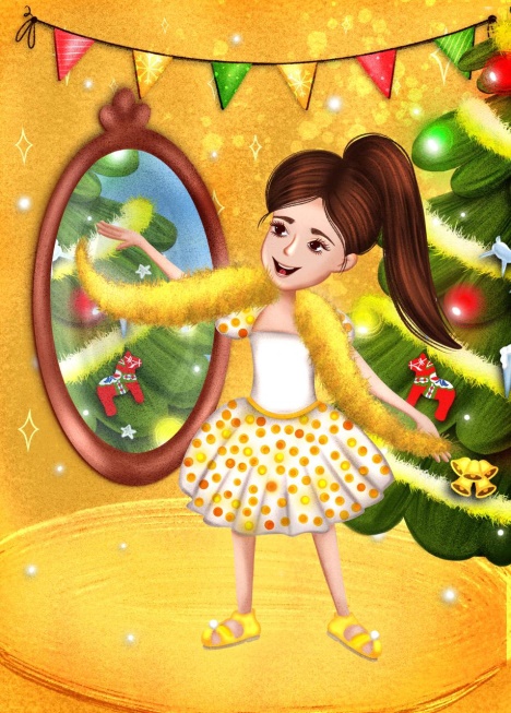 Теперь пришло время наряжаться и самой Даше. С утра она уже перемерила несколько платьев и наконец выбрала достаточно торжественное для встречи Нового года: белое балетное платье с пышной пачкой в золотой горох. А на ноги – золотые босоножки. Волосы Даша собрала в высокий хвостик. Она внимательно оглядела себя в зеркало. Как будто чего-то не хватало… Даша осмотрелась вокруг. Точно! Вот то, что ей нужно! Она сняла с ёлки большую золотую мишуру и накинула на плечи, словно боа, а затем снова взглянула в зеркало. Теперь она была полностью довольна увиденным.