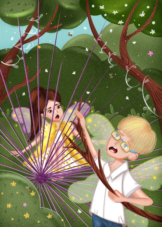 Гном снял с конвейерной ленты прозрачные фиолетовые крылья и передал их Румбусу. Эльф взял крылья одной рукой, поскольку в другой он держал ложку с пыльцой, и вдруг… чихнул! От его чиха пыльца взлетела с ложки маленьким блестящим облачком, которое затем осыпалось вниз дождём из блёсток. И часть из них попала на крылья для Даши. Тут Румбусу следовало бы быстренько стряхнуть пыльцу с крыльев, но он этого не сделал, поскольку невнимательно слушал маму. Наоборот, он решил, что так даже красивее и праздничнее: фиолетовые крылья, покрытые блестящей пыльцой, как будто светились изнутри. Румбус не знал, что в этот самый момент с ними происходило невероятное превращение: они обретали волшебную силу, с помощью которой можно было не только летать, но и перемещаться между мирами.