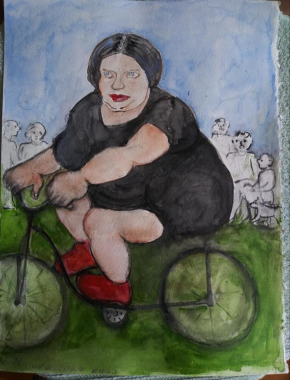 Зимой я рассказала моим коллегам-художникам Володе и Вадиму о моих неудачах, и об этой истории с велосипедом тоже. Ребята предложили такой план действий: во-первых, нагрянуть на квартиру коллекционера Евгения Нутовича и забрать у него мои работы, которые он повесил у себя «показать» кому-то, и висели они там довольно долго; потом навестить квартиру Курочкиных-Прохоровых и решить ситуацию с велосипедом. Купили по дороге бутылку коньяка, чтобы потом отпраздновать – победу ли, поражение. На звонок к Нутовичу открыл Нутович; увидел меня в компании двух дюжих молодцев, вынес работы. И даже приглашал войти, посидеть, но мы сослались на занятость и отправились к Курочкиным. На звонок к Курочкиным-Прохоровым-Толстым открыл старшенький, Глеб, сказал, остальные сейчас в театре. Предложил подождать, мы присели. Через какое-то время явились «остальные», то есть Саша, который сразу и молча прожмыгнул в спаленку, и двое младшеньких возглавляемые Катиной сестрой Таней Толстой, будущей великой писательницей и инструктором школы сквернословия. (Всё же, эта фамилия подходила Тане особенно, если делать ударение на первом слоге… И от красоты сестры Кати ей Господь не отломил ну ни крошечки.) Младшенькие проследовали в опочивальню. Мы завели речь о велосипеде. Таня приказала нам уйти, а если не уйдём – она вызовет милицию. Мы с готовностью согласились подождать милицию. Прибыла милиция в лице двух молодых людей. Я им вкратце рассказала историю. Таня кричала, показывая на меня своим толстым пальцем: «Да она сумасшедшая! Шизофреничка!» На что ей милиционеры отвечали простодушно: «Но это же не повод не возвращать велосипеда…» Милиционеры посоветовали мне получить велосипед через суд. Мы вышли на улицу впятером. Присели в сквере. Пытались угадать степень ответственности этой Тани за загородную коллекцию велосипедов, кто она: куратор, администратор, или просто заядлая велогонщица, и даже скорее, вело-угонщица, которой приглянулся велосипед моей дочки? Вон как она ощерилась своей клыкастой пастью, мол, уходите, не отдам! Вспомнили одну студенческую песенку о велогонщике и спели квинтетом припев: