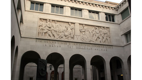 Эти площади разделены палаццо делла Раджионе, служившей первоначально местом заседаний городского суда. Внутри палаццо размещается внушительных размеров зал, служившей местом городских собраний. Особый интерес представляют фрески XV в. на астрологические сюжеты, которые я к сожалению, не смог осмотреть, ибо было уже поздно. К нему примыкает палаццо дель Муничипио.
