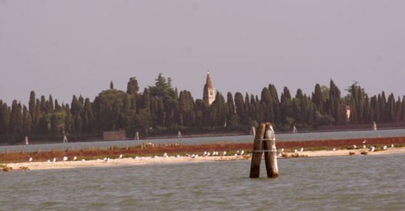 Кстати, проплывая по лагуне не мог не отметить еще один знаменитый остров. Остров Сан-Микеле. Этот остров ни что иное, как кладбище. Остров мертвых. На острове Сан-Микеле в древности был монастырь, от него сохранилась лишь церковь 15 в. Сан-Микеле-ин-Изола. Остров обнесен красной кирпичной стеной, поверх которой – другая стена, из кипарисов. Путь на кладбище ведет через портал, на котором Михаил побеждает дракона.