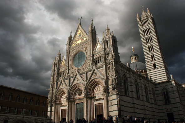 Сиенский собор (Дуомо) – общепризнанный эталон итальянской готики; в крипте – баптистерий со скульптурными работами делла Кверча, Донателло и Лоренцо Гиберти. К собору примыкает основанная в 1495 г. будущим папой Пием III библиотека Пикколомини с фресками Пинтуриккьо. «Маэста» Дуччо перенесена в действующий при соборе музей. Пока мы шли к собору на небо набежали низкие сизые тучи, которые «кагбэ» символизировали.