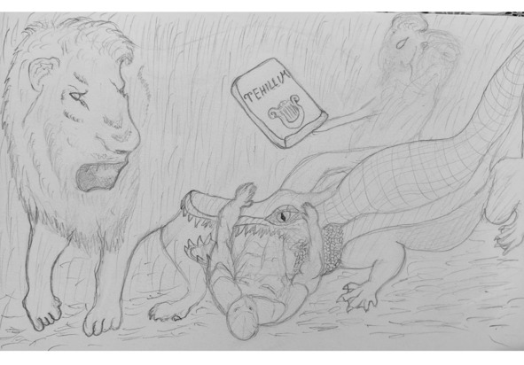Лион взвалил на свои плечи капитана, который уже не мог стоять на ногах, и направлял команду, а Давид вместе со львом шли сзади, обеспечивая безопасность раненным рыбакам, которые едва двигались. Навстречу Лиону из воды выскочил молодой аллигатор и свалил его, державшего капитана на плечах. В это время сзади подкрался другой крокодил и внезапно утащил капитана глубоко под воду. Лион оказался в опасности, перед открытой пастью напавшего пятиметрового аллигатора. Он едва успел схватиться за огромные и мощные челюсти аллигатора до того, как тот чуть не отхватил Лиону голову. Но долго удержать такую пасть невозможно. Аллигатор почувствовал сильные руки Лиона и взмахом головы сбросил его в сторону, а затем опять молниеносно набросился и схватил Лиона уже за талию! Дождь лился так сильно, что борьбу Лиона с аллигатором никто так и не заметил, как и падения капитана, который стал жертвой огромного крокодила. Давид думал, что Лион уже подошел к кораблю и ждет их с рыбаками. В это время аллигатор вонзил свои острые зубы в талию Лиона, но тот еще удерживал руками, как мог, смертоносные челюсти, которые чуть не перекусили его пополам. Лион держался за задние большие клыки аллигатора до сих пор, пока не начал чувствовать, что теряет сознание из-за мощного давления челюстей хищника! Глаза Лиона уже практически закрылись, как, сквозь туман он увидел силуэт девушки! Эта была та самая девушка, которую он встретил в тюрьме. Силуэт девушки по имени Сол стоял перед обреченным Лионом, находившимся на волосок от смерти, и в руках она держала молитвенную книгу Тейлим. У Лиона слезы покатились из глаз, и тогда он понял, что проиграл борьбу только потому, что отдалился от Всевышнего! Ведь он решил надеяться лишь на свою мощь. Лион со слезами на глазах начал просить прощения.