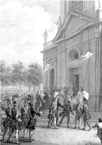 Екатерина в сопровождении солдат у церкви Казанской Божией матери.