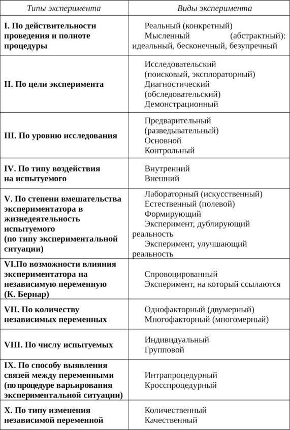 Существует множество взглядов на дифференциацию видов экспериментов и значительное число обозначающих их терминов. Совокупность основных разновидностей эксперимента можно представить следующим образом (табл. 1).