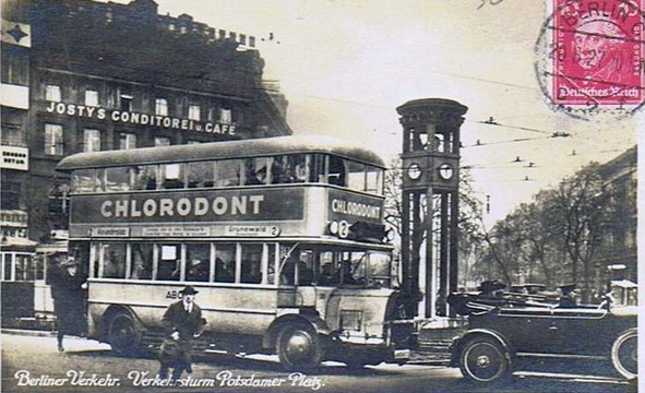 В 1920—1930-е годы в Берлине на главных маршрутах курсировали двухэтажные автобусы, как с открытым, так и с закрытым империалом (верхним этажом), на который сзади вела открытая изогнутая лестница. Сохранилось несколько фотографий таких автобусов с рекламой зубной пасты «Хлородонт», например, вот такая открытка: