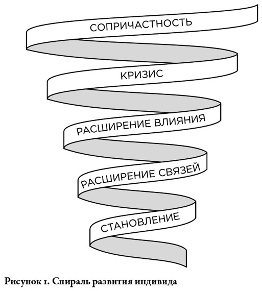 Схематически процесс развития любого актора процесса преобразования территории, о котором мы говорим далее, можно представить в виде расширяющейся кверху спирали. Нижние, самые узкие ее витки символизируют первые шаги индивида, вступление его в реальный мир, прокладывание себе дороги. С каждым новым витком субъект растет, приближается к зрелости и видит смысл своей жизни в служении обществу и человечеству в целом. Ради этого делается все: открываются бизнесы, организовываются некоммерческие общества, формируются политические партии. Если на первых витках ведется ожесточенная борьба за ресурсы и жизненное пространство, то на более высоких уже приобретается философская мудрость и талант к развитию гуманистических систем. Представленный ниже рисунок дает наглядное представление о том, через какие этапы проходит человек в своем развитии (рис. 1).