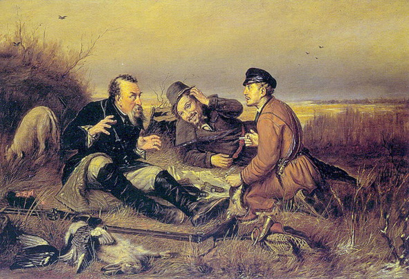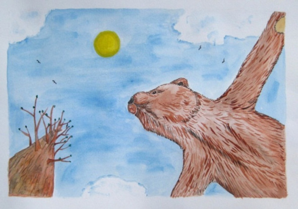 Рассказчик – Пошли мы с Трезором как-то раз на охоту – зайцев пострелять. Мы зашли в такие дебри, но зайцы куда-то все подевались. И вот мы вышли на полянку, подошли к берёзе, которая росла посередине поляны и только присели отдохнуть, когда неожиданно на краю поляны показался медведь.